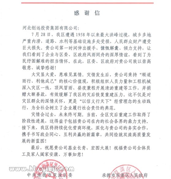 近日,承德市雙灤區(qū)區(qū)委、區(qū)政府向河北創(chuàng)遠(yuǎn)投資集團(tuán)發(fā)來感謝信,對(duì)創(chuàng)遠(yuǎn)集團(tuán)在今年抗洪搶險(xiǎn)期間第一時(shí)間伸出援手、與區(qū)委、區(qū)政府和當(dāng)?shù)厝罕婏L(fēng)雨同舟的深厚情誼,表達(dá)了誠(chéng)摯的感謝。